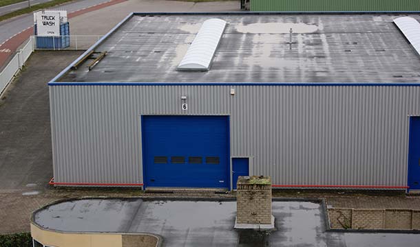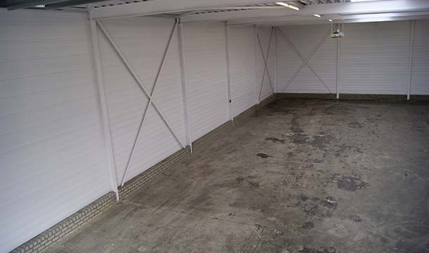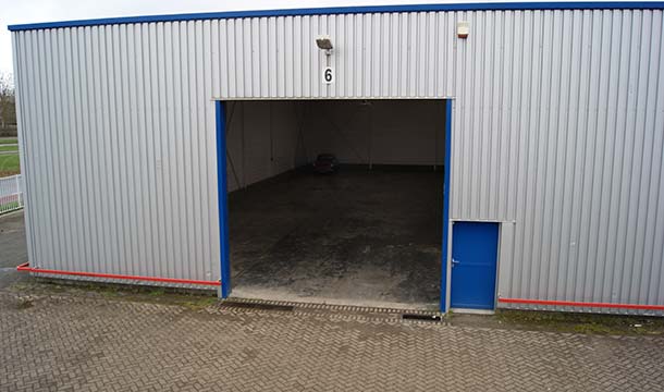 Voorzien van een elektrische sectionaalpoort (b x h 4,8 x 4,4 m) en separate toegangsdeur.
