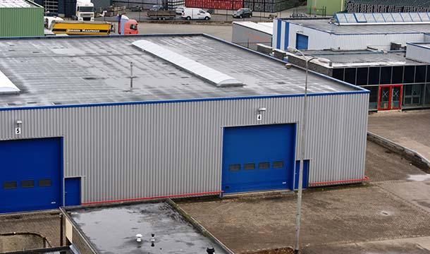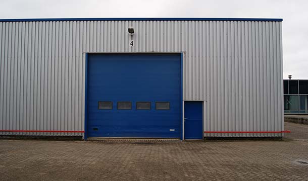 Voorzien van een elektrische sectionaalpoort (b x h 4,8 x 4,4 m) en separate toegangsdeur.